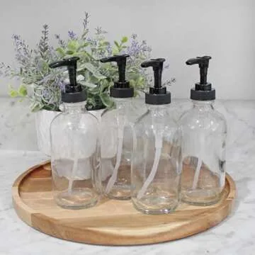 Show more The VALUE 4-PACK of Boston round bottles from Cornucopia Brands is designed for the environmentally conscious and aesthetically savvy consumer. Each set includes four 8oz clear glass bottles featuring BPA-free black plastic pump tops. These bottles are perfect for those who are looking to create a clutter-free and sophisticated space while maintaining a focus on sustainability. With a capacity of 8 fluid ounces (approximately 235 ml), each bottle stands at 7.1 inches tall with a diameter of 2.4 inches, making them a perfect fit for countertops, sinks, or bathrooms.