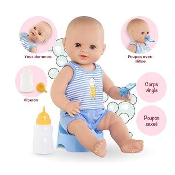 Corolle Drink and Wet Bath Baby Paul - 14” Boy Baby Doll with 3 Accessories - Bottle, Potty, and Pacifier - Really Drinks and Goes Potty, for Kids Ages 2 Years and up