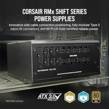 Show more The Corsair RM1200x Shift Fully Modular ATX Power Supply stands at the forefront of power supply technology, meticulously designed for users demanding both performance and efficiency. With its fully modular design and micro-fit PSU connectors, this power supply enables you to utilize only the cables your system requires, ensuring a clutter-free build that maximizes airflow. Streamlined for cutting-edge builds, it achieves optimum arrangements with minimal space, proving to be an invaluable asset for both aspiring and seasoned PC enthusiasts alike.