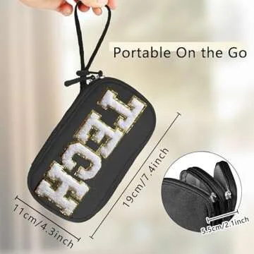 Show more Introducing the COSHAYSOO Small Electronics Organizer Travel Bag, your new favorite companion for keeping electronic accessories stylishly organized. This chic black bag is adorned with trendy glitter varsity chenille letter patches, adding a dash of personality to its multi-functional design. Whether you're navigating the bustling city or traveling across the country, this bag’s compact size of 19x11x5.5cm (7.4x4.3x2.1 inches) makes it easy to carry and a must-have for any tech-savvy individual. The spacious double-layer all-in-one construction provides ample room for all your essential gadgets, combining practicality with fashionable flair.