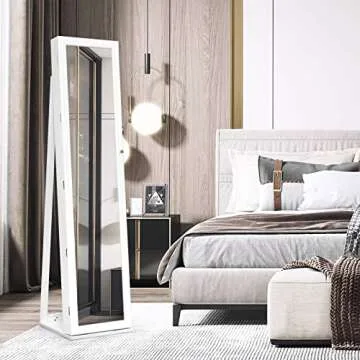 COSTWAY Standing Jewelry Cabinet, Large Capacity Jewelry Organizer w/Full-Length Mirror & Rear Storage Shelves, Lockable Mirror Jewelry Armoire with Keys for Girls Women (White)