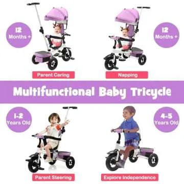 The tricycle features a **reversible 360-degree seat**, enabling precious face-to-face interactions with your baby. With an adjustable push rod ranging from **38" to 43.5"**, it caters to parents of all heights, ensuring comfortable steering. Additionally, the adjustable canopy tilts from 25° to 85°, providing protection from the sun or rain, making outings enjoyable in every weather condition.