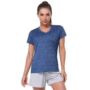 Show more Discover the ultimate blend of comfort, style, and performance with our women's short sleeve V-neck workout t-shirts. Crafted with a perfect fusion of 47% cation, 47% polyester, and 6% spandex, these tops are designed to meet the needs of every active lifestyle. Whether you're hitting the gym, attending a yoga class, or simply lounging at home, these shirts provide an exceptional wearing experience. The moisture-wicking power fabric ensures that you stay dry and cool, even during the most intense workouts.