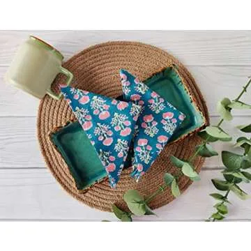 Show moreCotton Print Napkins 18x18 inches by Craftbot are the perfect blend of form and function, designed meticulously to bring style to your table while being environmentally responsible. Each set includes six beautifully hand-crafted napkins that reflect traditional Indian craftsmanship, intricately printed in vibrant teal blue with timeless paisley and floral designs. Made from 100% premium cotton, these napkins promise a soft touch and exceptional durability, enhancing your dining experience and adding a touch of elegance to any meal.