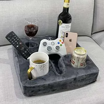 Introducing the Xchouxer Sofa Cup Holder Pillow, your new best friend for home relaxation and organization. This innovative product is designed to eliminate those annoying spills that can occur when you're lounging on your couch or bed. No more setting drinks on precarious ledges or the floor; this pillow features a versatile tray that holds up to four drinks alongside a dedicated pocket for your phone, glasses, and even remotes.