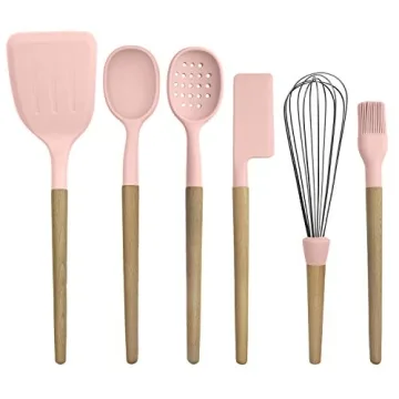 Country Kitchen Non Stick Silicone Utensil Set with Rounded Wood Handles for Cooking and Baking, 6 Piece Set, Pink