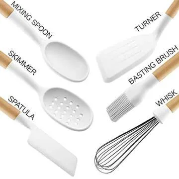 Country Kitchen Non Stick Silicone Utensil Set with Rounded Wood Handles for Cooking and Baking, 6 Piece Set, White