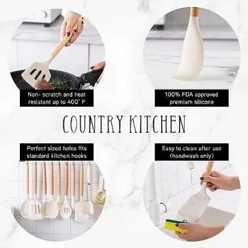 Country Kitchen Non Stick Silicone Utensil Set with Rounded Wood Handles for Cooking and Baking, 38 Piece Set, Khaki