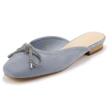 Coutgo Mules for Women, Flat Backless Comfort Loafer with Square Toe, Casual Slip on with Rhinestone Bow (10,Bluish Grey)