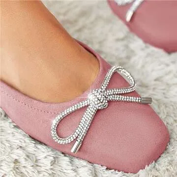 Coutgo Mules for Women, Flat Backless Comfort Loafer with Square Toe, Casual Slip on with Rhinestone Bow (7,Pink)
