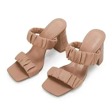 Show more Step into summer with effortless elegance in the Coutgo Womens Ruched Slides Sandals. These stunning shoes feature a chic square open toe design that beautifully showcases your pedicure while providing a modern silhouette. The chunky block heel not only adds a touch of sophistication but also offers comfort and stability, making them ideal for all-day wear. With dual elastic straps, slipping into these backless sandals is a breeze, allowing you to enjoy your sunny days without the fuss of buckles or laces.