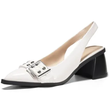 Show more Introducing the Coutgo Womens Slingback Chunky Block Low Heels – the perfect fusion of elegance and comfort! Crafted from premium smooth leather, these shoes feature sophisticated silver-colored metal buckle details that elevate their style quotient, making them a standout accessory in your wardrobe. With a classic pointed toe cap and a chic slingback strap, they not only offer effortless wearability but also enhance your overall look whether you're heading to the office or out for a night on the town.