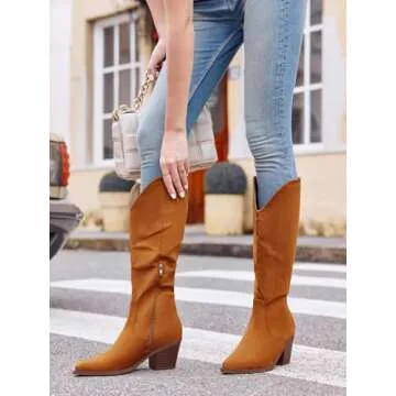 Coutgo Womens Wide Calf Cowboy Boots Suede Knee High Chunky Heel Pointed Toe Western Cowgirl Boots, Brown, Size 7.5