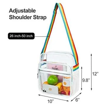 With dimensions of 10 inches wide, 12 inches high, and 4 inches deep, plus a front pocket that measures 10 inches wide by 9.8 inches high and 2 inches deep, you’ll find abundant space to store all your essentials. Need to grab your phone, wallet, or sunglasses quickly? The clear format allows you to do a quick visual check to ensure you have everything you need without ransacking through your bag.