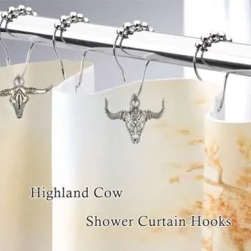 Show more The Highland Cow Curtain Hooks are a stunning addition to any bathroom, designed to bring a touch of the Western aesthetic right into your home. Crafted with a metallic finish, these hooks beautifully reflect light, creating a glamorous visual effect that will captivate anyone who enters your bathroom. Their exquisite design is just the right mix of traditional and modern, making them an ideal choice for cow-themed or Western cowboy bathrooms.