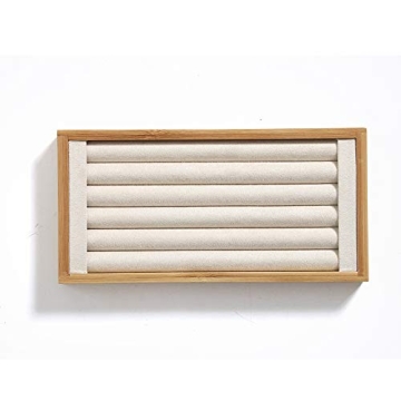 Show moreIntroducing a beautifully crafted jewelry organizer that celebrates the innate elegance of bamboo and the softness of suede. This stunning piece features a frame made of natural bamboo that showcases the lovely lines and textures inherent to the wood. The gentle beige suede lining not only complements the bamboo perfectly but also offers a soft and luxurious cradle for your precious rings and earrings. Whether you have a burgeoning collection or a simple yet elegant set of favorite pieces, this organizer is ideal for displaying or storing your jewelry.