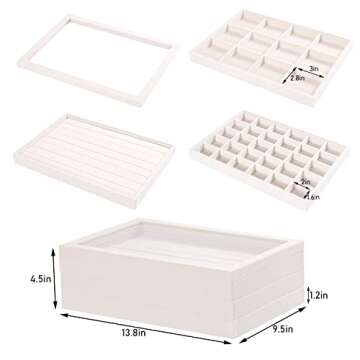 Coward Stackable Jewelry Trays Organizer Set with Clear Lid, Trays for Drawer, Earring Necklace Bracelet Ring Display Organizer (beige(ring+12girds+30girds+The glass lid))