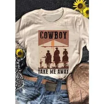 Cowboy Take Me Away O-Neck T-Shirt for Women Western Cowboy Vintage Graphic Tees Cowgirls Western Rodeo Tee Tops(Large,Apricot)