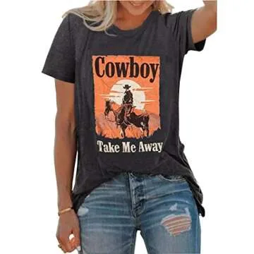 Cowboy Take Me Away T-Shirt for Women Western Cowboy Vintage Graphic Tees Travel Tops (Dark Grey, Small)