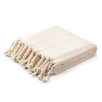 milky fleece, measures 50" x 60", offering a luxurious embrace for those chilly evenings or lazy afternoons. Its creamy hue brings elegance to any room, whether it’s draped over your couch or laid gracefully across your bed. The stylish tassels add a touch of whimsy, elevating your decor while providing a warm ambiance. Perfect for snuggling, the blanket’s super soft and fuzzy texture makes it irresistible to use while watching movies, reading, or even napping.
