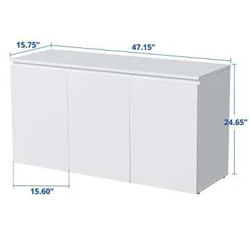 Show moreIntroducing the Cozy Castle Buffet Cabinet, a beautifully crafted piece of furniture designed to add both style and functionality to your home. This versatile cabinet comes in a timeless combination of pure white, black, and oak finishes, making it a perfect fit for any room’s decor. Whether you need a stylish addition to your dining space or a practical solution for your kitchen or living room, this buffet cabinet meets all your storage needs with elegance. Measuring at 47.15" L x 24.65" H x 15.75" W, it provides ample space without overwhelming your home. With its simplistic design, the Cozy Castle effortlessly enhances your interior while serving a multitude of storage functionalities.