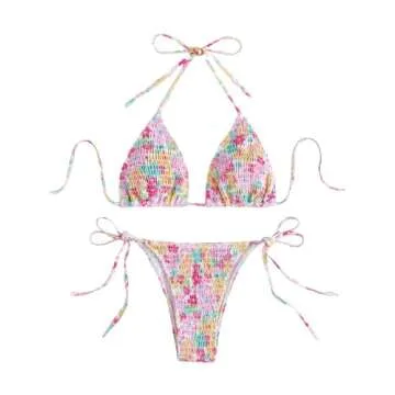 With its backless tie design and adjustable drawstring sides, this bikini can be tailored to showcase your individual style. The halter top offers excellent support while enhancing your natural silhouette, and the chic triangle thong bottom adds a touch of allure that is sure to turn heads. No need to worry about compromising on quality; our bikini is made to last, with a fabric that maintains its vibrant colors through many summer adventures.