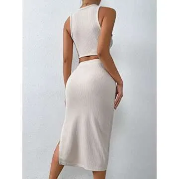 Show moreStep into style and comfort with the COZYEASE Women's 2 Piece Outfit, expertly crafted to elevate your wardrobe essentials. This chic ensemble features a sophisticated sleeveless ribbed knit crop tank top paired with a stunning split thigh bodycon midi skirt. The lightweight and breathable fabric ensures a flattering drape while keeping you comfortable throughout the day, making it the perfect choice for sunny outings or casual events. With its versatile beige hue, easily mix and match with your favorite accessories for any occasion.