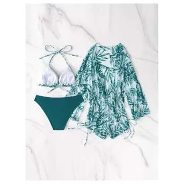 COZYEASE Women's 3 Piece Swimsuits Hawaiian Tropical Print Bikini Set Halter Drawstring Side Bathing Suits with Cover Up