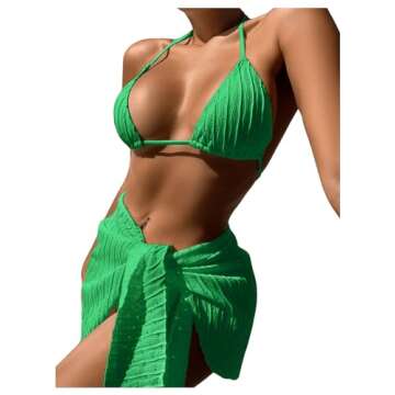 Show more Introducing the Cozyease Women's 3 Piece Swimsuits Set Eyelet Embroidery Halter Triangle Bikini with Cover Up Beach Skirt – your ultimate companion for beach days or pool parties! This stunning swimsuit set features a chic halter neck design and a fashionable backless tie, giving you the perfect blend of style and comfort. Crafted with a luxurious fabric composition of 82% Polyester and 18% Elastane, it boasts high stretchability for a flattering fit while remaining soft against the skin. The eye-catching green embroidery adds a unique touch, making this set a standout choice for any swimwear collection.