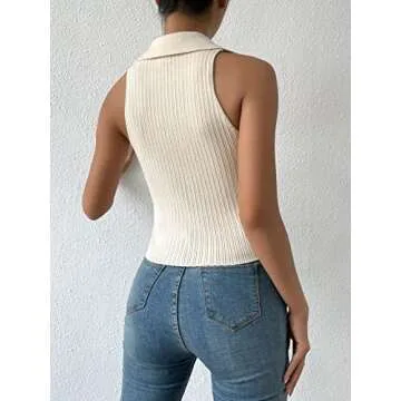 Features: Collared, ribbed, solid color, ribbed knit, sleeveless, casual, plain