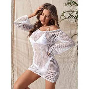 COZYEASE Women's Long Sleeve Backless Knitted Cover Up Swimsuit Hollow Out Crochet Swimwear Beach Dress White M