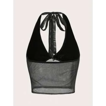 Features: Floral graphic, backless, rhinestone, tie back, crop, slim fit, crop, halter, sheer, mesh, casual, comfy, trendy, soft.