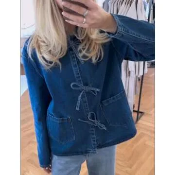 COZYPOIN Women's Tie Front Bow Denim Jacket Cropped Jean Shirts Lightweight Long Sleeve Fall Top with Pockets(Blue-S)