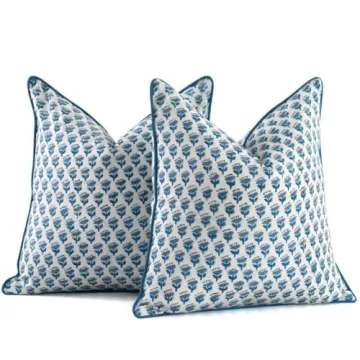 Show more Transform your living space with these exquisite apatite blue farmhouse pillows, crafted from soft, high-quality cotton. Designed for versatility, this set of 2 pillows features a striking 20x20 inch size, making them ideal for both indoor and outdoor use. Whether you need to spruce up your living room, bedroom, or even your car, these pillows can adapt beautifully to any setting. The teal piping enhances the modern aesthetic of the vintage-inspired patterns, drawing inspiration from the intricate designs found in India’s historic forts.