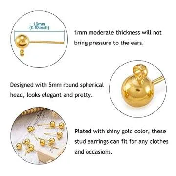 Craftdady 100Pcs Gold Ball Post Earring Studs 16x5mm Brass Ear Pins with 1.5mm Loop for Jewelry Earring Making