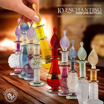Show more Introducing the CraftsOfEgypt Genie Blown Glass Miniature Perfume Bottles, a stunning collection of ten handcrafted vials that stand at an elegant 2 inches (5cm). Each bottle is an artisanal masterpiece, meticulously mouth-blown by skilled craftsmen in Egypt, offering not only a decorative accent for your home but also an heirloom quality that narrates a story of tradition and artistry. Say goodbye to mass-produced imitations and welcome the uniqueness of these vividly colored treasures into your collection.