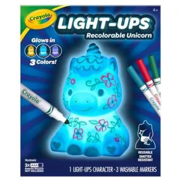 Show more Introducing the dazzling Light-Ups Unicorn by Crayola, an enchanting creativity toy designed to bring the vivid colors of imagination to life! This captivating unicorn features a unique recolorable light-up design that allows young artists to express their creativity continually. Each set includes the charming unicorn, along with three washable markers in vibrant hues of Magenta, Green, and Turquoise Surf, catering perfectly to the artistic flair of your little ones.
