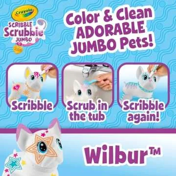 Show more Introducing the Scribble Scrubbie Pets Jumbo, an interactive and creative playset that brings joy to children while fostering their artistic expression. This exceptional product features a lively 6-inch pet, Wilbur, a charming French Bulldog who can be posed to accompany your child's adventures. Unlike any other toy, Wilbur's head and legs are poseable, making him the perfect sidekick for imaginative play.