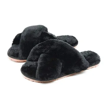 Show more Elevate your home footwear game with our exquisite black cross band slippers, designed with a chic criss-cross fashion statement that exudes glamour while keeping you cozy. Crafted from soft faux fur and lined with plush terry cloth, these are perfect for ladies seeking a blend of style and warmth. With a delightful touch of glitter trim, these slides shine as a fashionable companion for any indoor or outdoor setting.