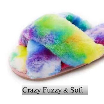 Crazy Lady Women's Fuzzy Fluffy House Slippers Cute Plush Memory Foam Shoes Cross Band Indoor Outdoor Open Toe Sandals(06/Rainbow, 5.5-6.5)