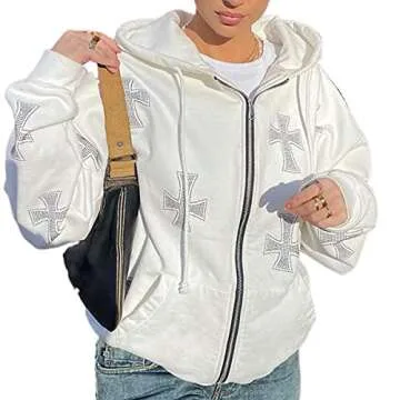 Creaion Rhinestone Graphic Zip Up Hoodies for Women Oversized Y2k Sweatshirt Jacket E-Girl 90s Pullover Streetwear