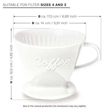 Show more This exquisite porcelain coffee dripper is a perfect combination of elegance and functionality. With its sleek white color and ergonomic design, it brings a touch of sophistication to your daily coffee ritual. Crafted by a renowned brand dedicated to quality craftsmanship, this dripper ensures that every cup is not just coffee; it’s an experience. The dripper stands approximately 12.5 cm tall and boasts a diameter of 14 cm, making it compatible with standard filter bags in sizes 4 and 2.