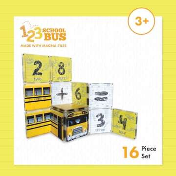 CreateOn Magna-Tiles Structure-Building Set for Kids, 123 School Bus Magnet Tiles, Magnetic Kids’ Building Toys, STEM Toys for Boys and Girls Ages 3+, 16 Pieces