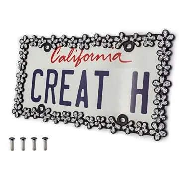 Creathome 3D Shining Daisy Wrenth License Plate Frame from Pure Zinc Alloy Metal Perfect Plate Holder,Matt Black with Silver Glitter