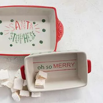 Creative Co-Op 12" L x 6-3/4"W x 3" H 2 Quart Hand-Painted Stoneware Baker w/Handles Oh So Merry, Red & Green