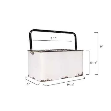 Show moreDiscover effortless organization with this vintage-inspired portable caddy. Made from **durable metal construction**, this unique caddy features six generous storage compartments, making it the perfect companion for any home or workspace. Its **distressed enamel finish** not only enhances its aesthetic appeal but also complements a variety of decor styles, from rustic farmhouse to modern minimalist. Whether you're looking to organize silverware and napkins for dinner parties, keep office essentials tidy, or showcase dried florals in a stylish way, this caddy has you covered. At **11 inches L x 6.25 inches W x 9 inches H**, it's compact yet spacious enough to accommodate your needs. The comfortable handle ensures easy transport, whether you're moving it from the kitchen to the dining room or from your craft corner to the living room. To maintain its stunning look, simply **wipe clean with a dry cloth**, ensuring that it remains a stunning focal point in your home. With its versatile design and functional use, this caddy is destined to become a cherished item in your collection.