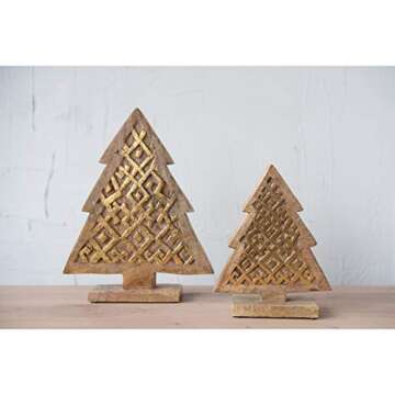Show moreIntroducing the Creative Co-Op Hand-Carved Mango Wood Tree – a unique decorative piece that transforms any space into a whimsical wonderland. This stunning tree stands at 7 inches tall and measures 2.25 inches wide, boasting a height of 8.75 inches. Expertly crafted from durable mango wood, this tree is not only a testament to artisanal craftsmanship but also brings a touch of nature indoors with its organic lines and warm hues. The exquisite gold accents create a shimmering finish that catches the eye, making it an elegant addition to any holiday décor or year-round display. Whether set against a backdrop of miniature buildings or mingling with charming animal figurines, Santa, or snowman accents, this tree surely elevates your decorating game while adding a festive flair to your home.
