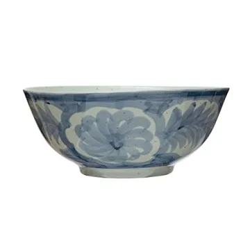 Creative Co-Op Hand Painted Stoneware Bowl with Floral Design, Blue and White