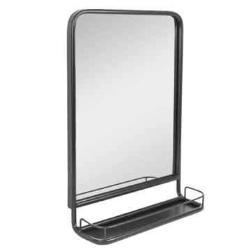 Show moreTransform your living space with this stunning contemporary wall mirror, designed to enhance both functionality and style in your home. Featuring a robust black metal frame and an integrated shelf, this mirror is perfect for various settings, such as your bathroom, bedroom, or entryway. Its sleek design complements any decor while providing practical storage solutions. Measuring 19.5 inches wide and 27.5 inches high, it fits seamlessly in small spaces without compromising on elegance.