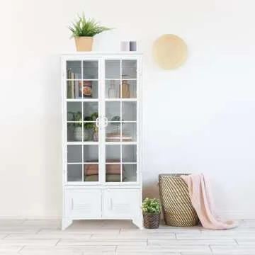Show moreTransform your living space with the Creative Co-Op Metal Shelves & 4 Doors Cabinets and Shelf Units in Azure White (EC0261). This beautifully designed storage solution combines modern style with practical functionality, making it the perfect addition to any home decor. Measuring at 27 inches in length, 15 inches in width, and 57.5 inches in height, this shelving unit provides ample space to display your cherished books, decorative figurines, and elegant plates and mugs behind the clear glass doors. Its stunning azure white finish adds a fresh and contemporary touch to any room, enhancing your decor with a pop of color while keeping a clean and airy feel.